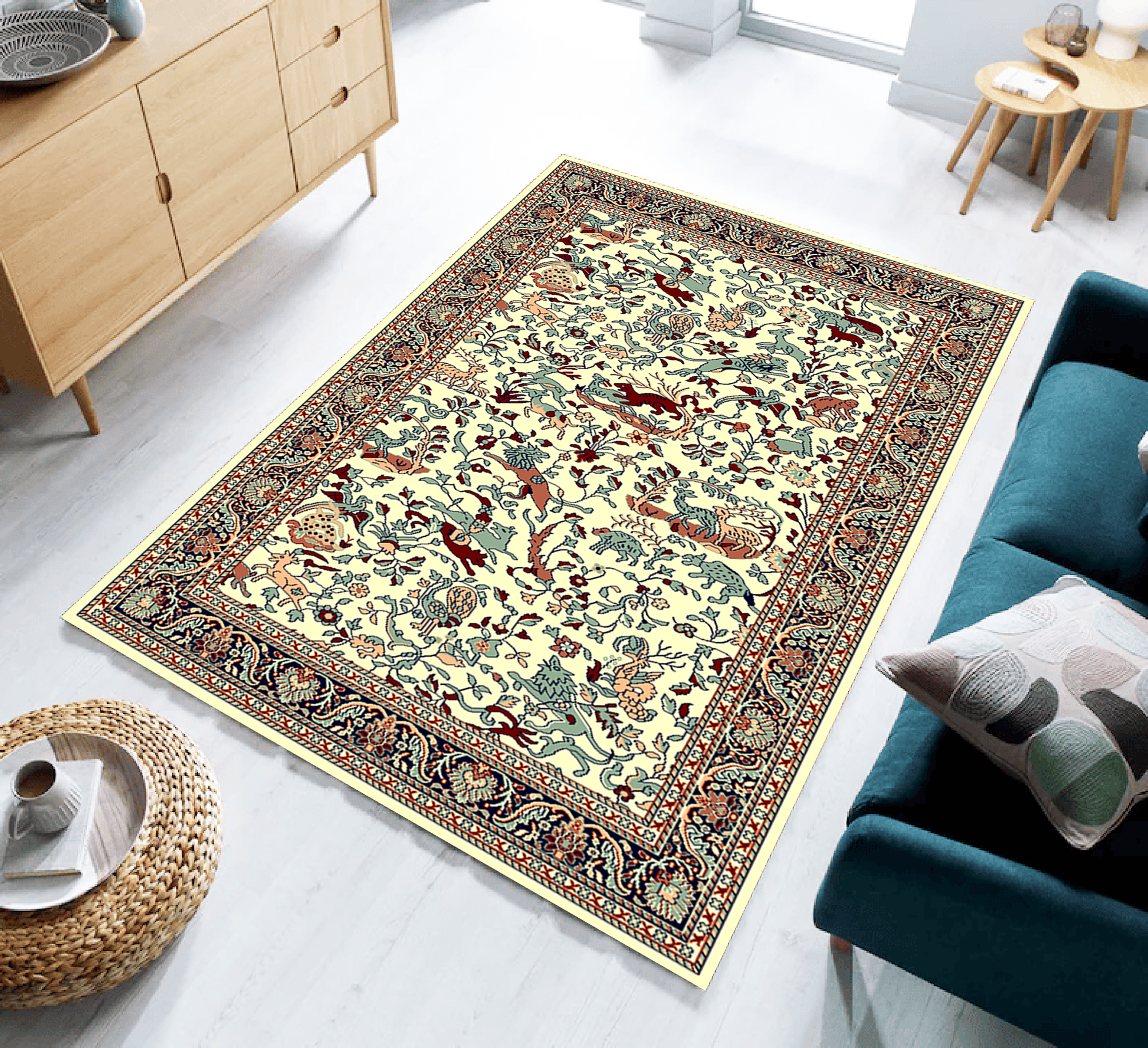 This 4x6 Floral Eden carpet showcases an intricate “Tree of Life” design blending animals, birds, and florals into a harmonious narrative pattern. Its artistic and mythical composition brings vibrant elements of nature into any space, making it a sophisticated choice for those who appreciate fine craftsmanship and storytelling through décor.